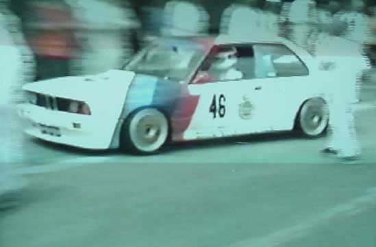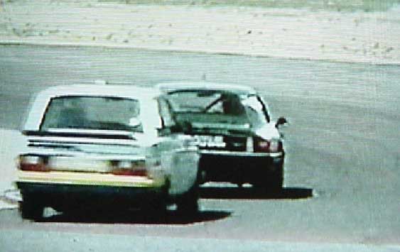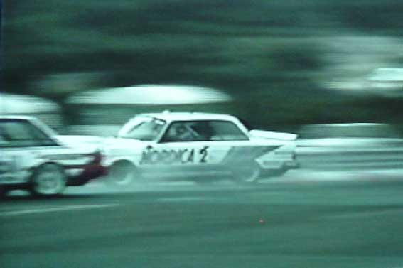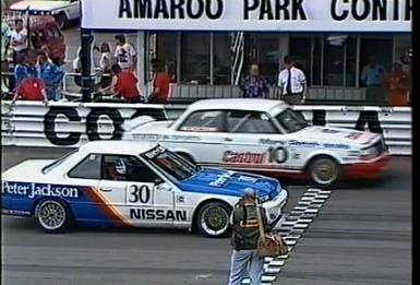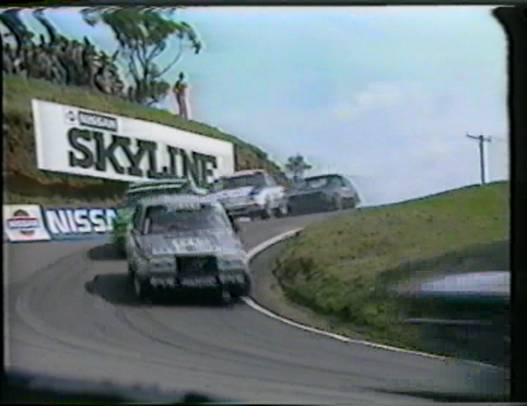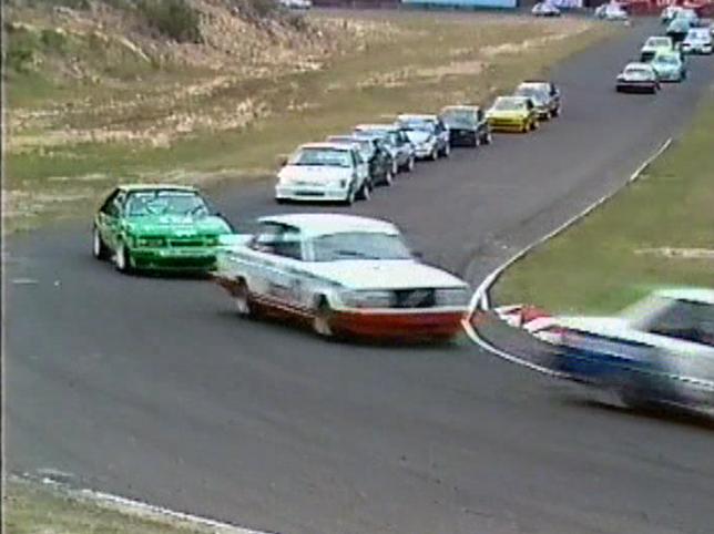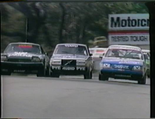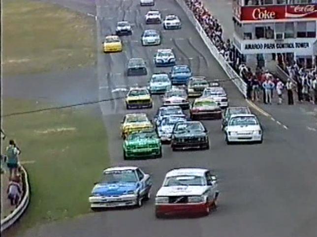 and Jaguar XJ12. Robbie Francevic, driving the #10 Mark Petch Volvo 240 Turbo, started in #2 position behind the #30 Nissan Skyline driven by George Fury. At the start, the Volvo out-accellerated the Skyline in a drag race up the hill to turn 1 and took the lead. The Skyline took the lead back a short time later and then the Volvo took it away again. The Volvo then began extending its lead further and further. At lap 12 the Volvo had created a 3 second lead over the next challenger and kept gaining. With 5 laps remaining, the Volvo had obviously eased up quite a bite and still had a lead of more than 6 seconds, but a challenger emerged in the #62 BMW 635 CSi driven by Jim Richards (the 1985 ATCC champion). The BMW began closing the lead by up to 2 seconds per lap in a strong effort to catch the Volvo, which appears to have exhausted its tires. Final laps... 4 second lead... then 3 seconds, then 2 seconds, then less than 1 second. And Volvo wins! |