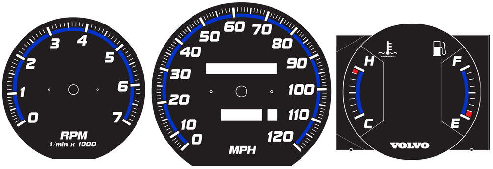 INFO and F.A.Q.'s BELOW... HIGH-QUALITY PRINTED ADHESIVE BACKED VINYL GAUGE FACE OVERLAYS All sets are custom printed to order. These face overlays are the product of years of development using 240 instrument clusters from my own cars and from junkyards. I originally began designing them for my own 245 Turbo in 1999. I then received so many requests from other 240 owners that I decided to make them available for a modest price. ABOUT