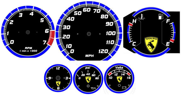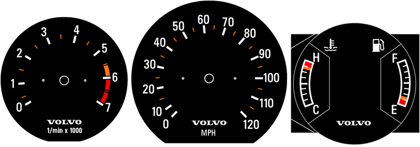 Volvo 1800 Gauge Faces This is a white face overlay set for Smith's Volvo 1800 faces. These faces are now available with a 120 mph or 200 kmh speedometer. They are also available as BLACK faces also for restoring old faces. Installation instruction for these faces (2.5 mb PDF) CLICK HERE FOR INSTRUCTIONS. |