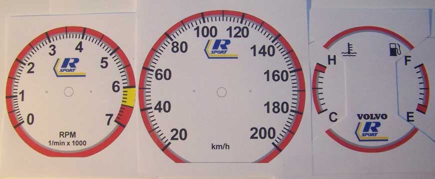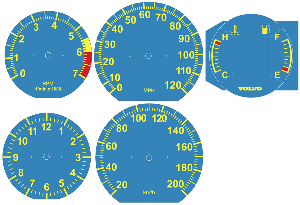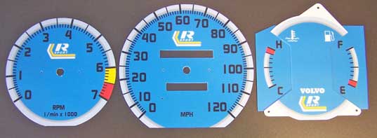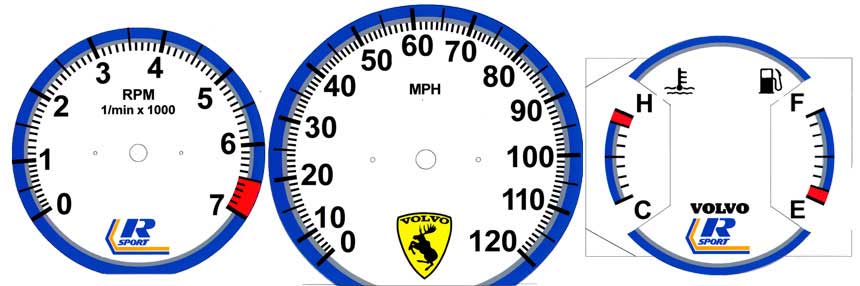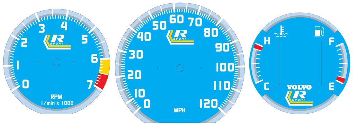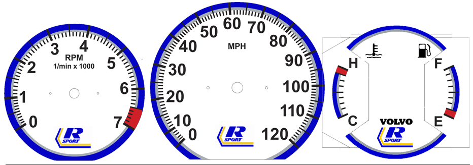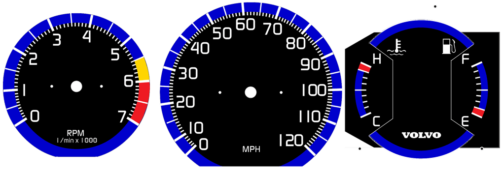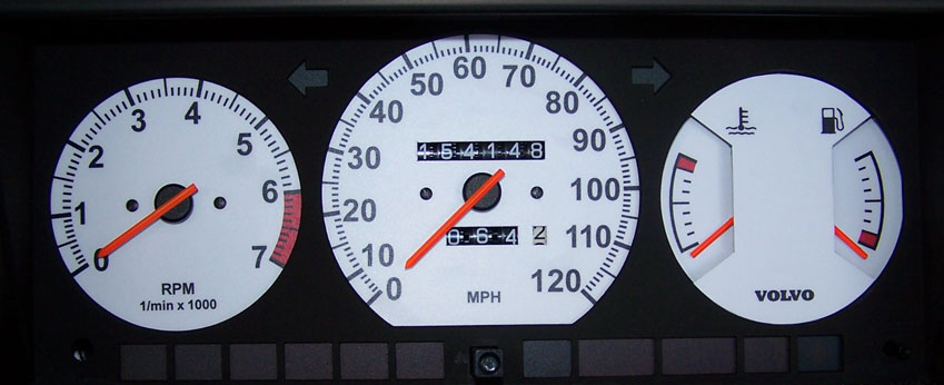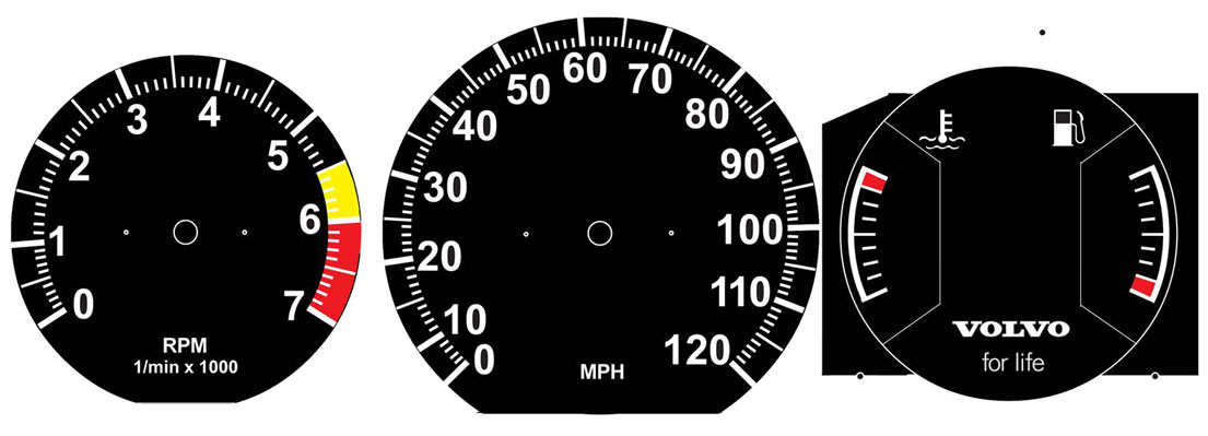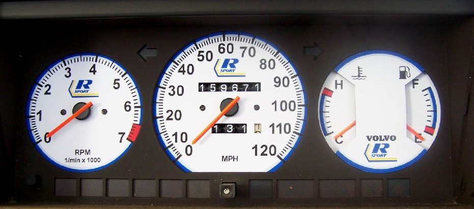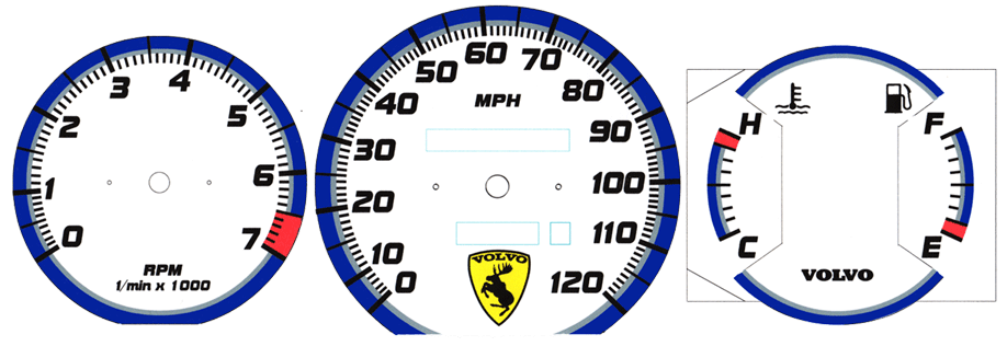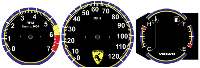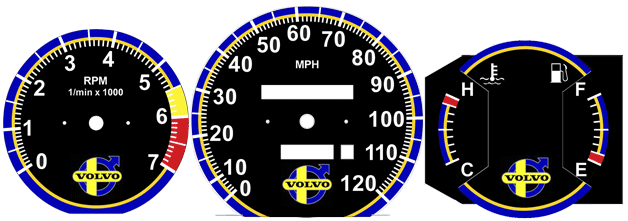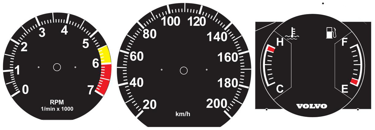 to bottom of tach. VOLVO on temp/fuel and
