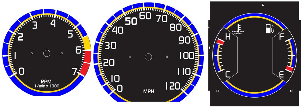 OPTIONAL: Large (in dash) Clock Face is also available instead of a Tach. Above sets will normally come with the "H", "C", "F" and "E" printed on Temp and Fuel gauges. You may order your faces without these letters if you like (no extra charge). I am able to do other limited color